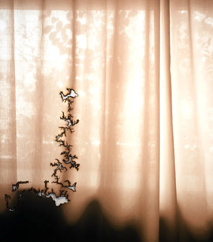 artwork, we give a nod to the Surrealist’s process of “automatic drawing.” Fractal burning was discovered by a German Experimental Physicist, George Lichtenberg (1742 – 1799) who also authored The Waste Books. The performative burning technique requires a unique collaboration between us and two points of electricity, resulting in beautiful fractals of charred deposits from electrical currents.