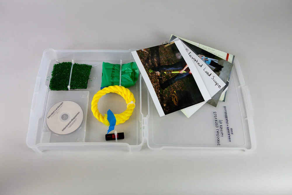In collaboration with the playwright Kirk Lynn of Austin, Texas, the collaborative team of Hillerbrand+Magsamen, explores the idea of family identities and structures through the metaphor of lawn care. As a man (Hillerbrand) dressed in his business suit stands in his own little world on a lawn that is literally “elevated” 10 feet above the ground on a wooden platform, he tries to maintain a green lawn while his wife (Magsamen) below chops the platform down with an ax. It is the man’s own internal flaws that bring himself and the "lawn" down.