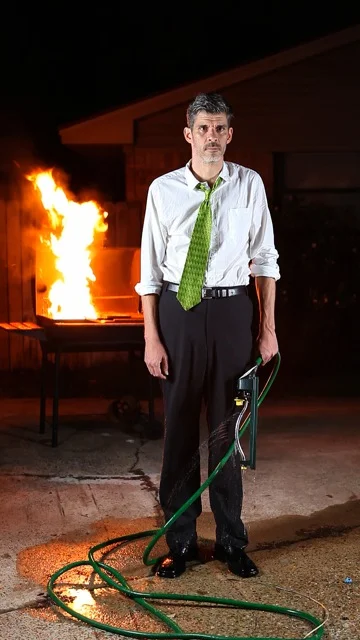 Family Portrait is a 4-channel video installation creating “living portraits” of themselves and their two children. Each member of their family: Father, Mother, Daughter, and Son has a video where they are engaging individually in an action. These actions are given an unexpected twist of surrealism such as the daughter getting sucked up by stuffed animals, the son smashing a stack of plates, the mother walling herself into her closet with bricks and feathers, and the father standing idle with a garden hose while the barbeque grill ignites.