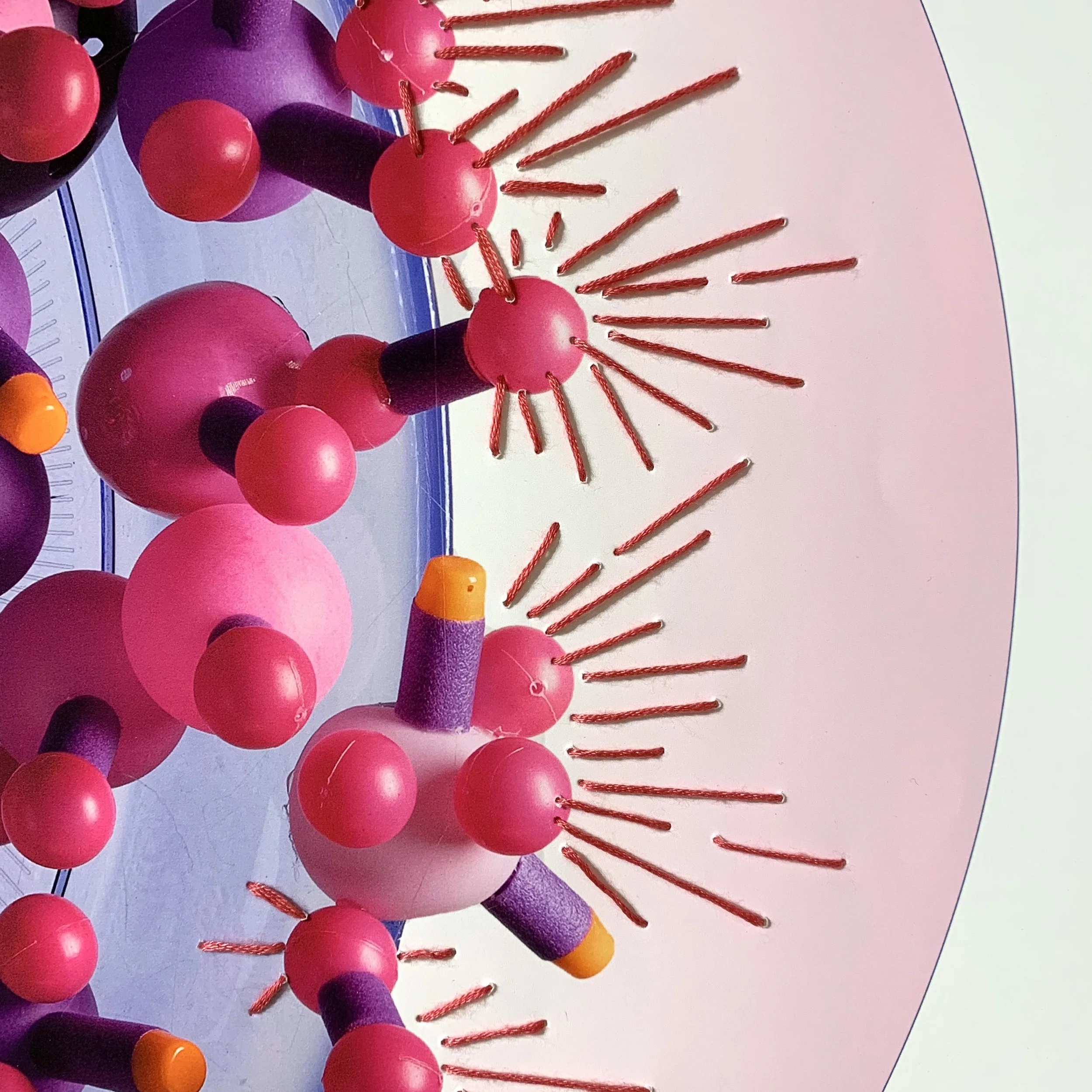 Each photograph in this project is a unique moment with hand stitching into the image. We combine found objects into sculptural pieces, photograph them and then stitch into the images. The transformation of everyday objects into something resembling biological microscopic images adds an element of scientific curiosity, inviting the viewer to contemplate the hidden beauty and complexity that lies just beneath the surface of our everyday surroundings.